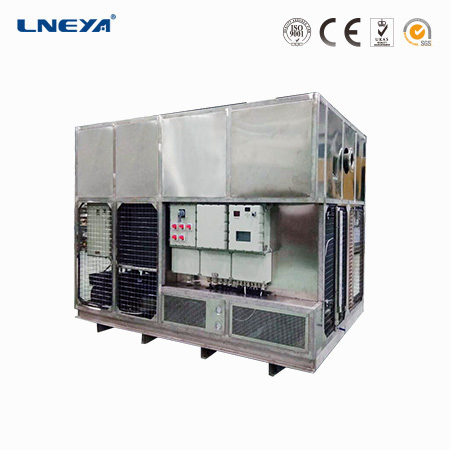 設備采用壓縮機制冷-制冷系統工作時由壓縮機排出的高溫高壓制冷劑氣體進入冷凝器被冷凝成高壓過冷液體,經膨脹閥節流降壓變成低溫低壓的汽液兩相混和物進入蒸發器(一級換熱器、二級換熱器、三級換熱器),制冷劑在其內吸收通過蒸發器的導熱介質的熱量進行自身氣化,制冷劑充分氣化后再被壓縮機吸入壓縮室進入下一輪循環。導熱介質通過循環泵輸送到氣體冷凝冷箱與氣體進行換熱。整機系統通過以上過程不斷循環,從而達到氣體連續降溫液化回收的目的。